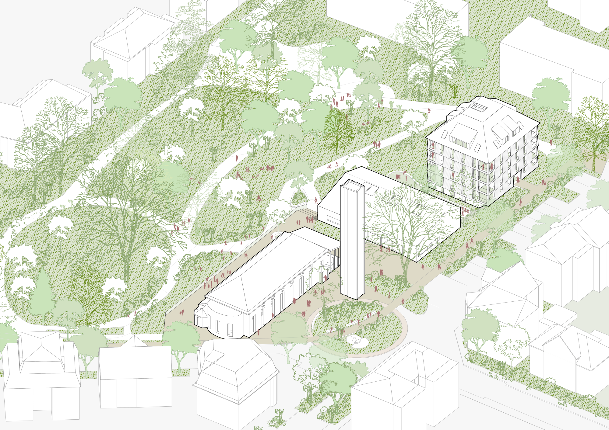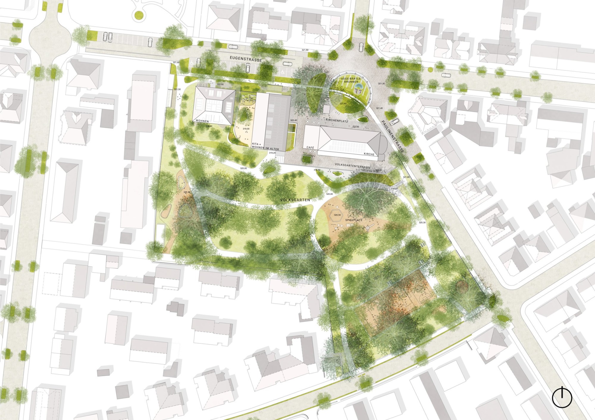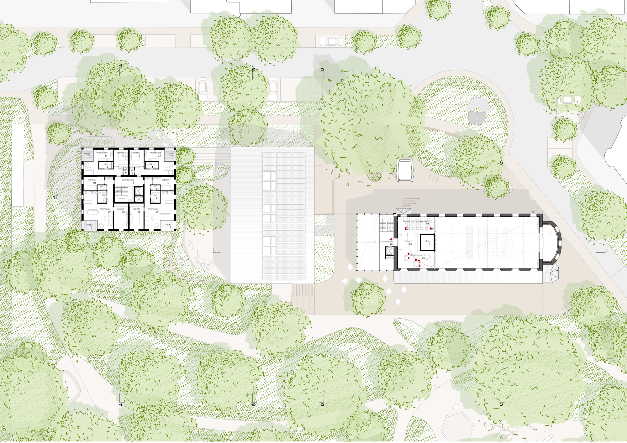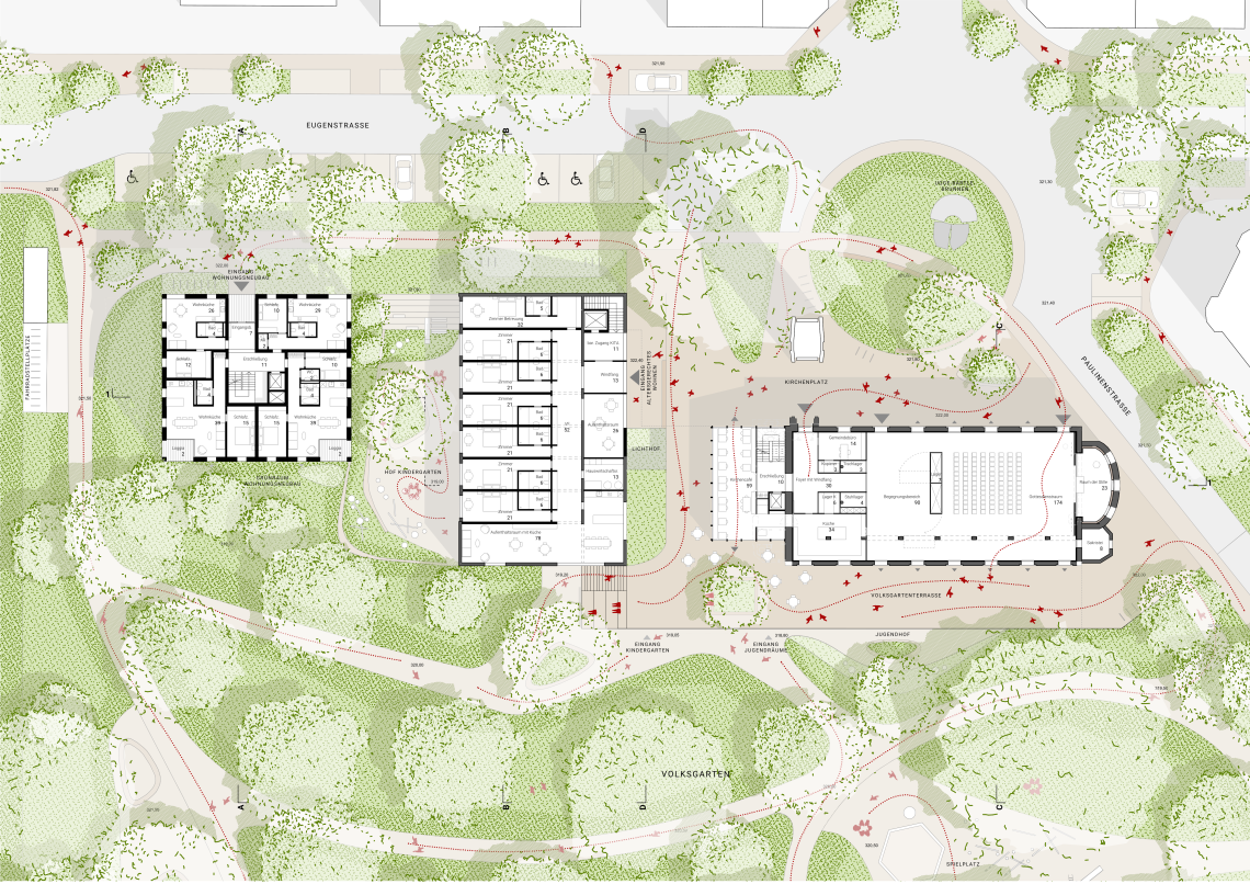 Das Projekt rund um die Eberhardskirche in Tübingen verfolgt einen behutsamen Umgang mit dem Bestand und stärkt das Zusammenspiel von Kirche, Volksgarten und umgebender Bebauung. Präzise gesetzte Baukörper reagieren auf Topographie und Stadtraum, schaffen neue Blickbezüge und qualitativ hochwertige Freiräume. Die Erweiterung der Kirche durch ein gläsernes Café belebt den Ugge-Bärtle-Platz als neuen Treffpunkt der Südstadt. Ein neu geordneter Fußweg verbindet Platz, Kirche und Volksgarten barrierefrei. Der Kindergarten liegt geschützt auf Parkniveau und ermöglicht Kindern direkten Zugang zur Natur, während im ehemaligen Gemeindehaus altersgerechtes Wohnen vorgesehen ist – ein Konzept des generationenübergreifenden Miteinanders. Der kompakte, nachhaltig konzipierte Holzbau bietet flexible Wohnungen und gemeinschaftliche Räume. Bestehende Bauten werden energetisch optimiert, Materialien wiederverwendet. Das Freiraumkonzept stärkt den Volksgarten durch gezielte, zurückhaltende Eingriffe, schafft neue Aufenthaltsqualitäten und fördert ökologische Vielfalt – ein ganzheitlicher Ansatz zwischen Bestand, Nachhaltigkeit und sozialem Mehrwert.