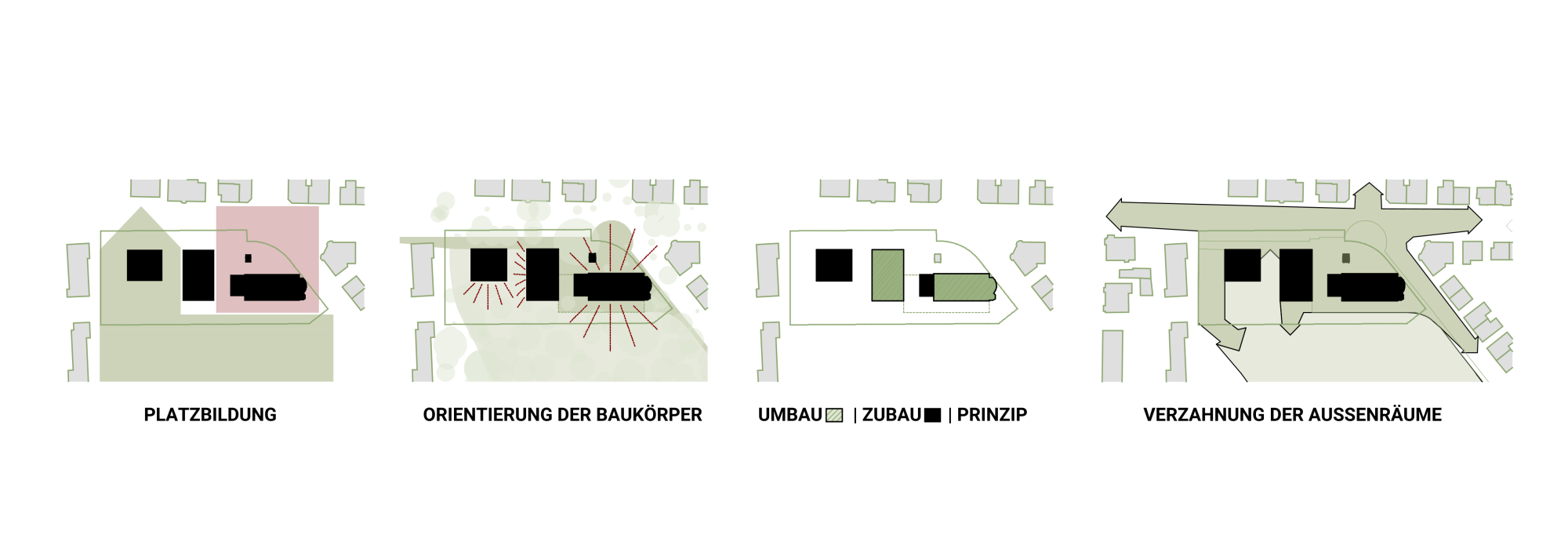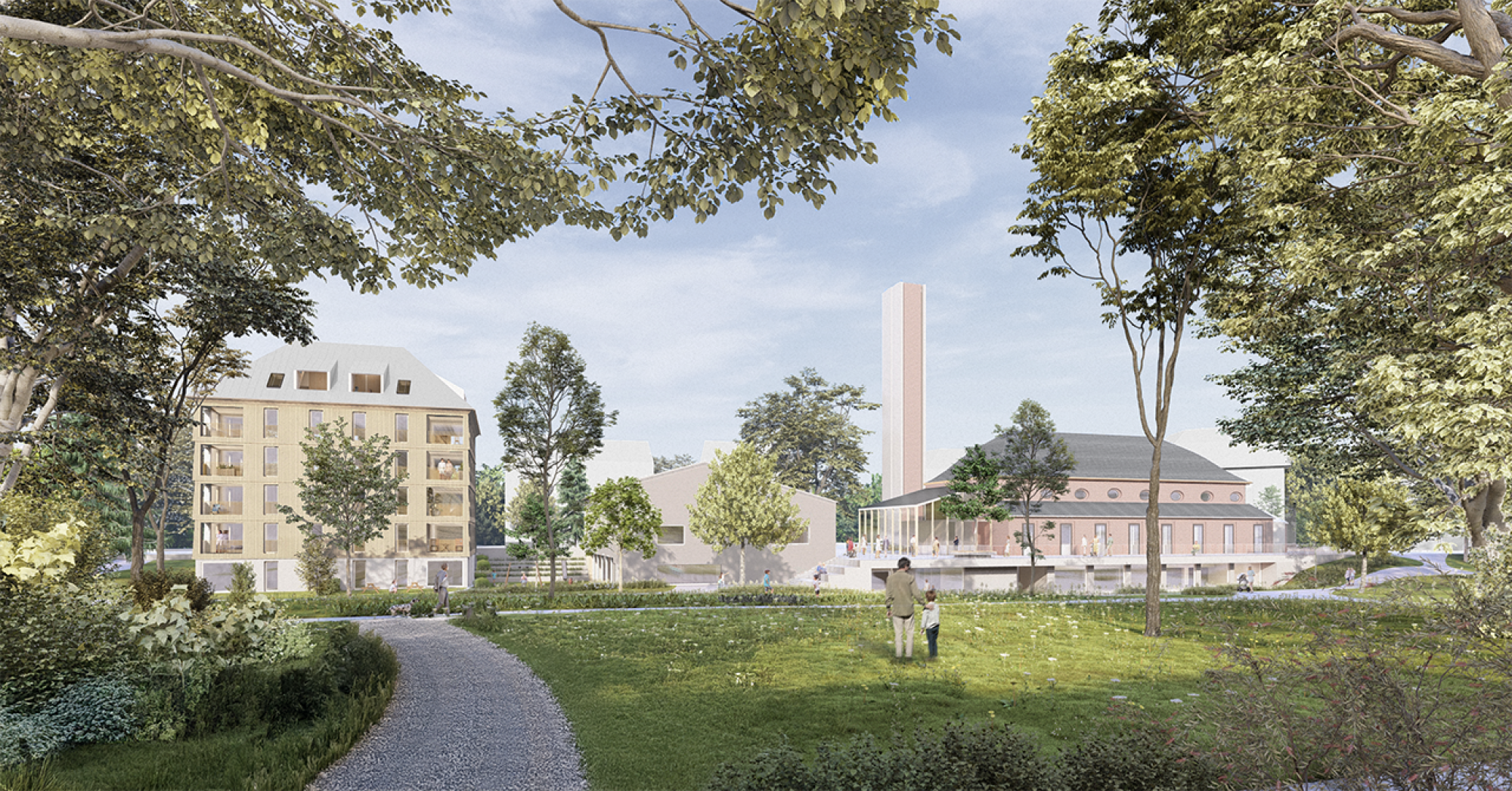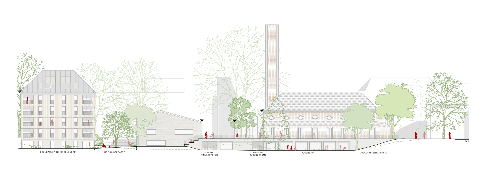 Das Projekt rund um die Eberhardskirche in Tübingen verfolgt einen behutsamen Umgang mit dem Bestand und stärkt das Zusammenspiel von Kirche, Volksgarten und umgebender Bebauung. Präzise gesetzte Baukörper reagieren auf Topographie und Stadtraum, schaffen neue Blickbezüge und qualitativ hochwertige Freiräume. Die Erweiterung der Kirche durch ein gläsernes Café belebt den Ugge-Bärtle-Platz als neuen Treffpunkt der Südstadt. Ein neu geordneter Fußweg verbindet Platz, Kirche und Volksgarten barrierefrei. Der Kindergarten liegt geschützt auf Parkniveau und ermöglicht Kindern direkten Zugang zur Natur, während im ehemaligen Gemeindehaus altersgerechtes Wohnen vorgesehen ist – ein Konzept des generationenübergreifenden Miteinanders. Der kompakte, nachhaltig konzipierte Holzbau bietet flexible Wohnungen und gemeinschaftliche Räume. Bestehende Bauten werden energetisch optimiert, Materialien wiederverwendet. Das Freiraumkonzept stärkt den Volksgarten durch gezielte, zurückhaltende Eingriffe, schafft neue Aufenthaltsqualitäten und fördert ökologische Vielfalt – ein ganzheitlicher Ansatz zwischen Bestand, Nachhaltigkeit und sozialem Mehrwert.