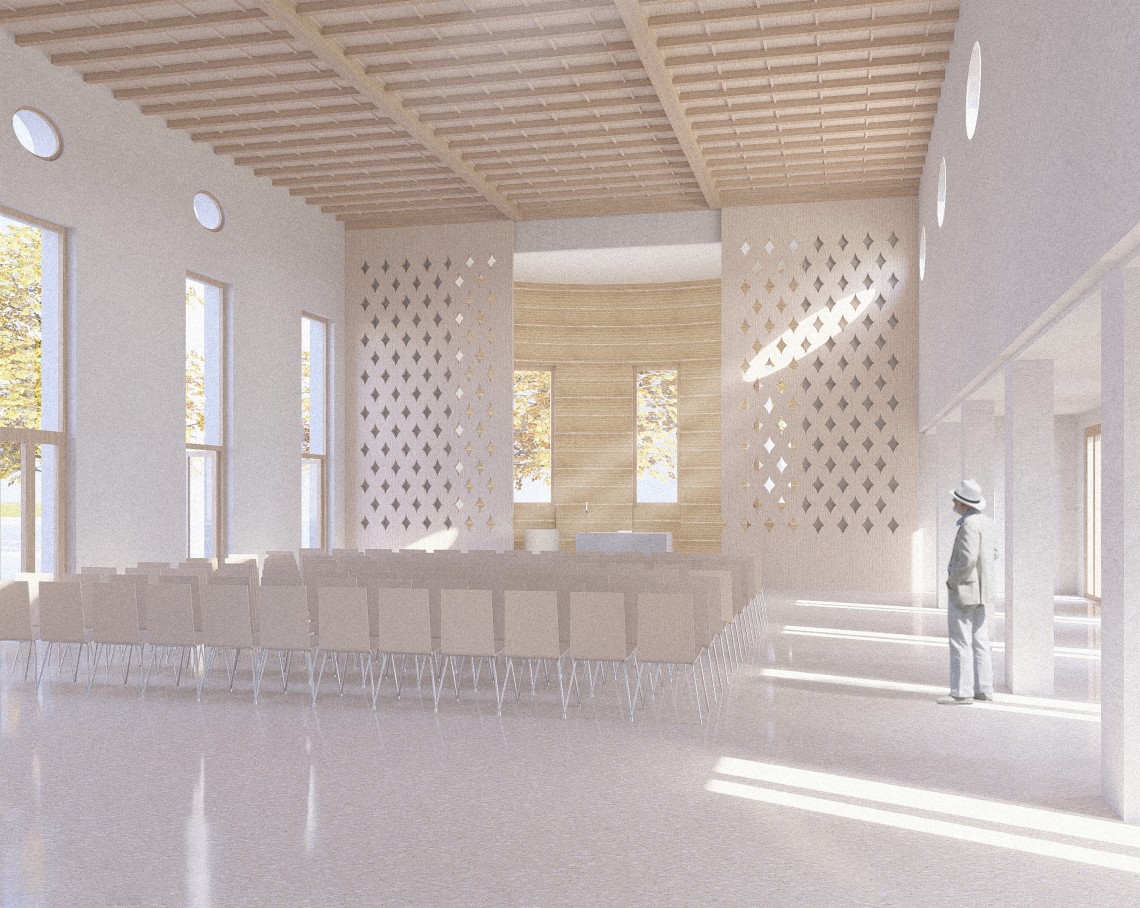 Die architektonische Umsetzung basiert auf klaren, ressourcenschonenden Prinzipien. Der Wohnungsneubau nutzt eine wirtschaftliche Holzbauweise mit sichtbaren CLT-Decken, standardisierten Achsrastern und vorgefertigten Fassadenelementen. So entstehen flexible Grundrisse, die durch einfache Anpassungen barrierefrei nutzbar sind. Im Inneren sorgen helle Materialien, Holz und Textilien für eine warme Atmosphäre. Der Kindergarten profitiert von großzügigen, lichtdurchfluteten Räumen und einem geschützten Spielhof mit direktem Zugang zum Park. Die Kirche erhält durch eine erhöhte Bodenebene, helle Ahornmöbel und Lehmkalkputz ein harmonisches Raumklima; mobile Trennelemente erlauben vielseitige Nutzungen vom Gottesdienst bis zur Veranstaltung. Im Freiraumkonzept werden historische Wegeführungen respektiert, der Ugge-Bärtle-Platz begrünt und als sozialer Mittelpunkt gestaltet. Neue Bäume, wasserdurchlässige Beläge und Sitzstufen fördern Aufenthaltsqualität und Klimaanpassung – ein städtebauliches Konzept, das Tradition, Gemeinschaft und Zukunft vereint.