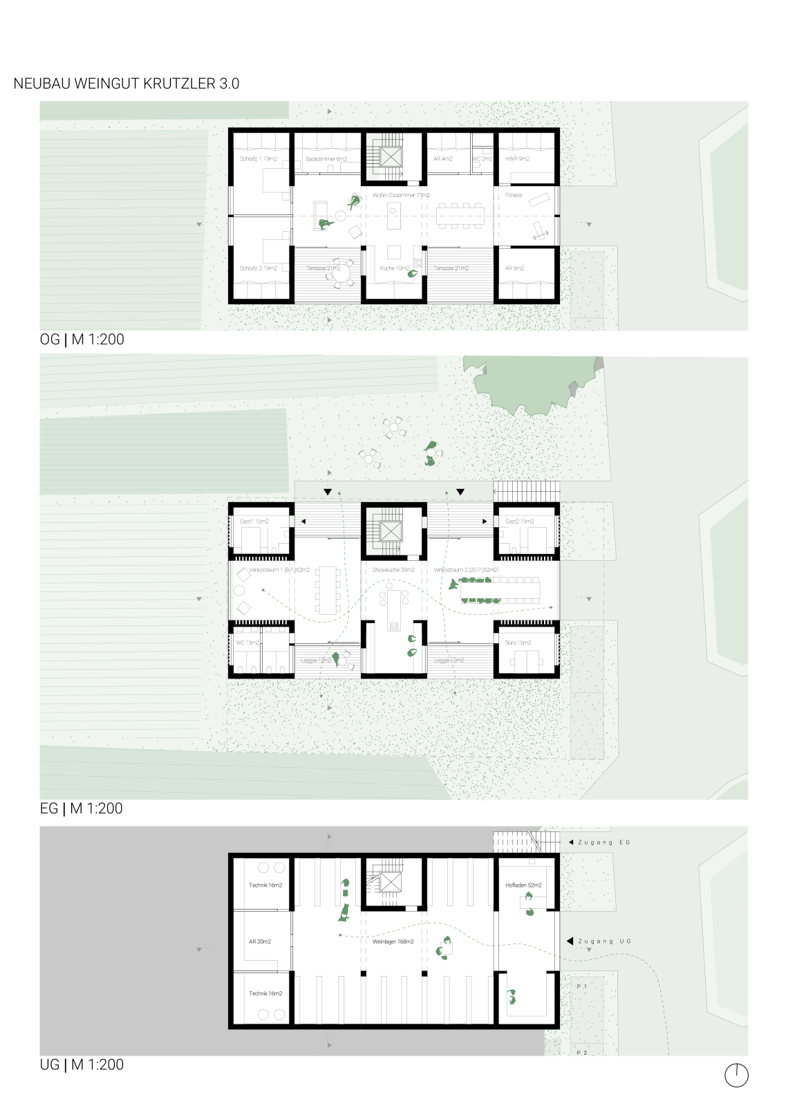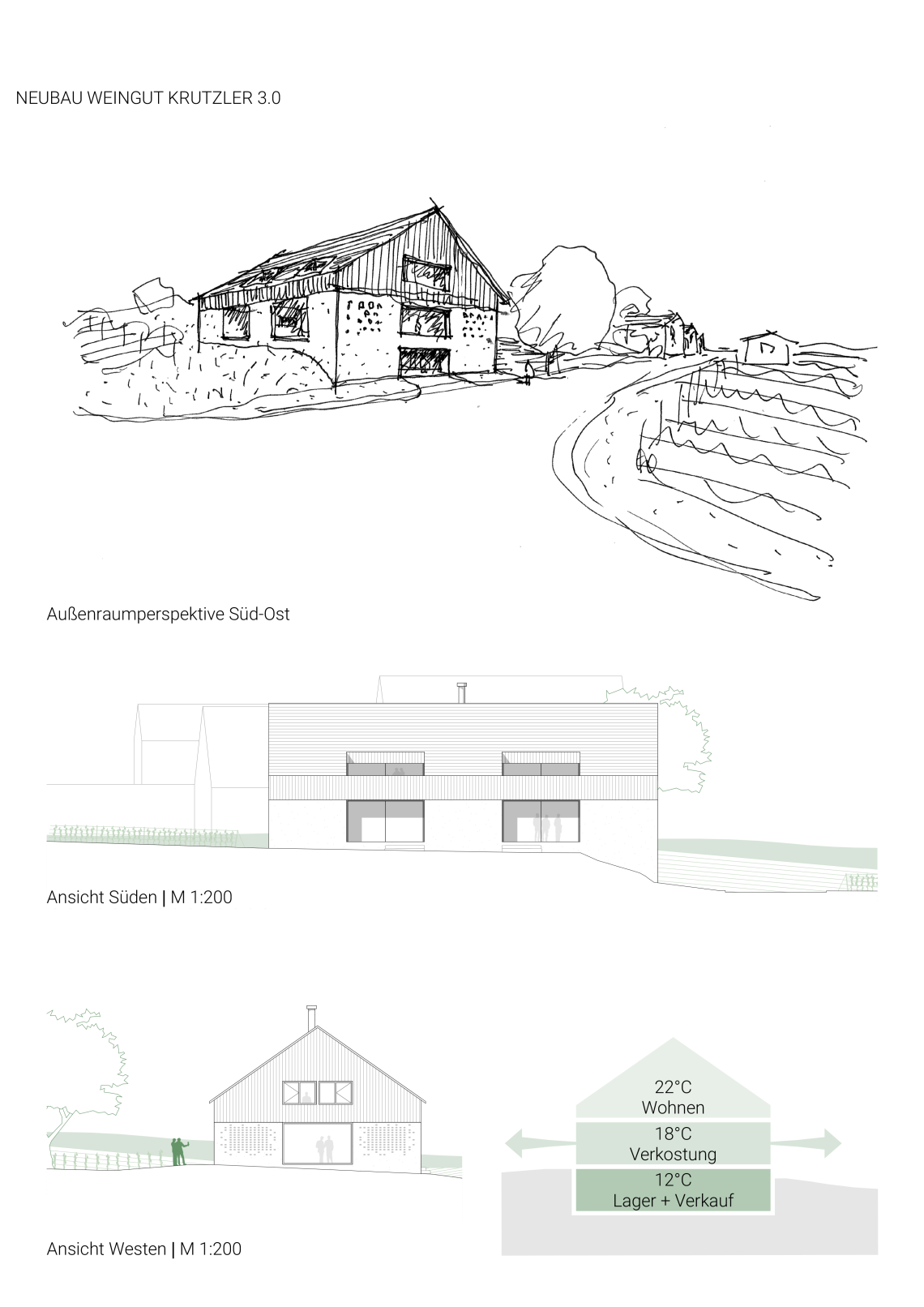 Das Erdgeschoss wird von Norden her erschlossen und besteht aus sechs gemauerten Blöcken, welche einen großzügigen repräsentativen Verkostungsraum umschließen, der sich zu allen Seiten mit raumhohen Öffnungen in die umgebende Landschaft erweitert. Im hölzernen Dachgeschoß ist das Wohnen untergebracht, welches der konstruktiven Struktur folgt und um einen zentralen, bis unter den First emporragenden Wohnbereich organisiert ist. Dieser öffnet sich über zwei teilüberdachte Terrassen nach Süden.